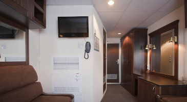 Люкс 2м+ (средняя палуба) Двухместная каюта со всеми удобствами, расположенная на средней палубе. Номера кают: 315–318, 323–328, 333, 334, 337–340. В каюте: двуспальная кровать (можно раздвинуть), диван, кондиционер, телевизор, сейф, внутренний телефон, холодильник, ванная комната (раковина, душ, туалет), фен, туалетные принадлежности (шампунь, гель для душа, мыло), полотенца, два больших открывающихся обзорных окна. Возможно размещение ребенка до 14 лет (включительно) на дополнительном спальном месте. |