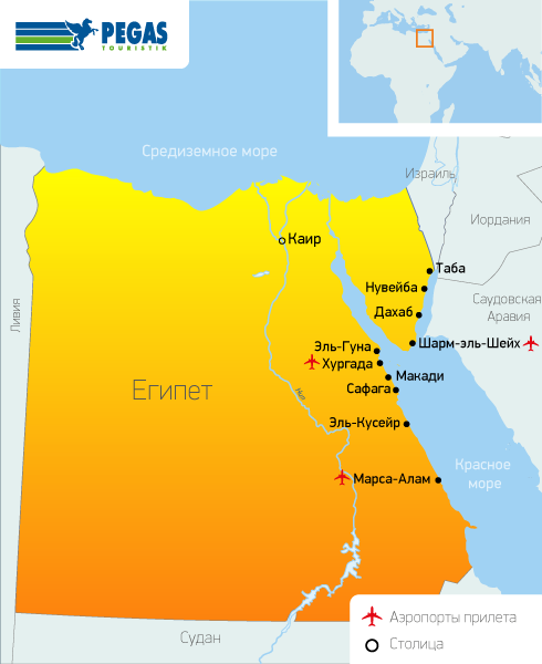 Международный аэропорт Хургада (HRG) в городе Хургада. До выбранного отеля вас доставит групповой или индивидуальный трансфер "Пегас Туристик".