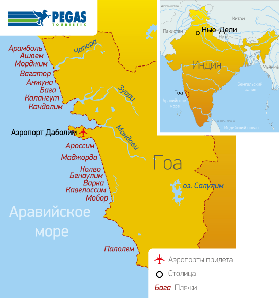 Самым популярным из туристических направлений в Индии является богатый на тропическую экзотику штат Гоа. Компания PEGAS Touristik поможет подобрать Вам тур в этот маленький кусочек рая. Гоа славится своими разнообразными пляжами — от скалистых до укрытых нежным бархатистым песком, от открытых для солнечных лучей до защищенных зелеными листьями высоких пальм, раскинувшихся по всему побережью, которое омывается водами Аравийского моря.